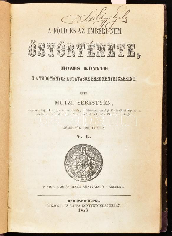 Mutzl Sebestyén: A föld és az emberi-nem őstörténete, Mózes könyve s a Tudományos kutatások eredményei szerint. Németből fordította: V.E. Pest, 1853, Lukács L. és Társa, VIII+342 p.+1 (kihajtható tábla) t. Korabeli aranyozott gerincű átkötött félvászon-kötés, kopott borítóval, kissé foxing foltos lapokkal.