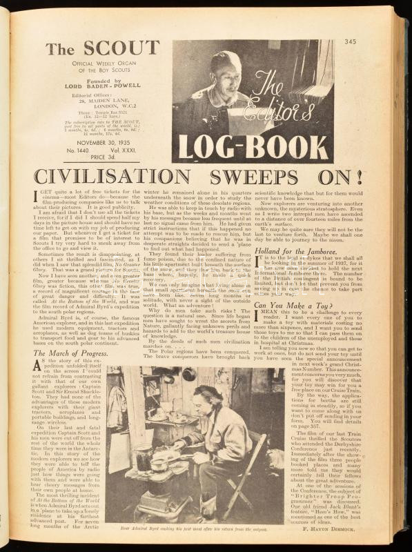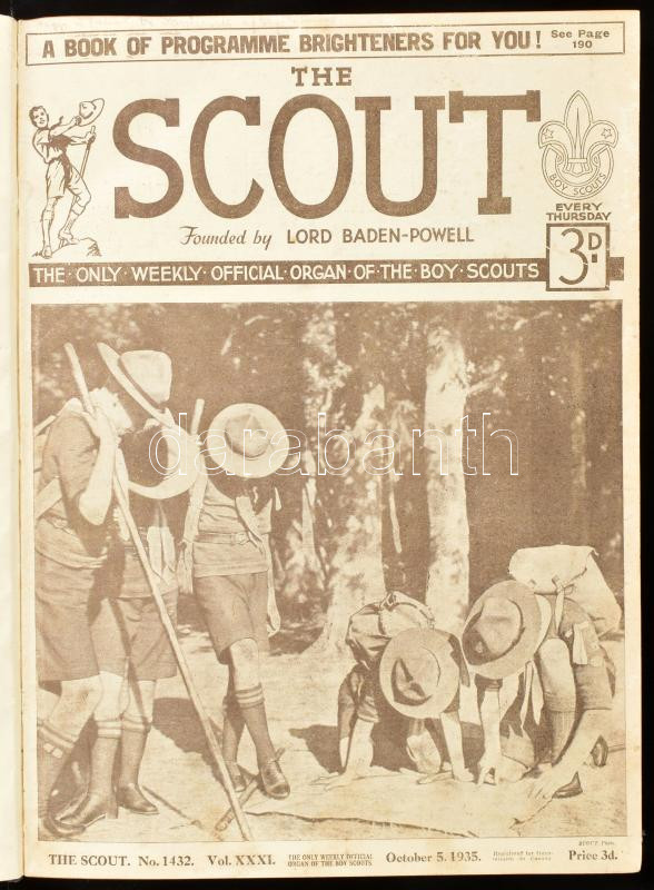 1935-1936 The Scout c. angol cserkészeti folyóirat egybekötött számai (1935. október - 1936. június). Fekete-fehér képekkel illusztrálva. Félvászon-kötésben, kissé sérült, ázott, foltos borítóval.