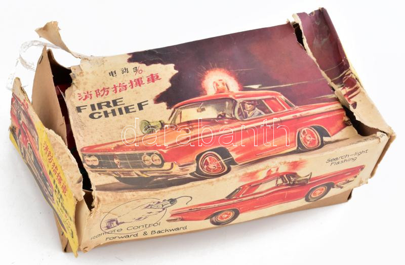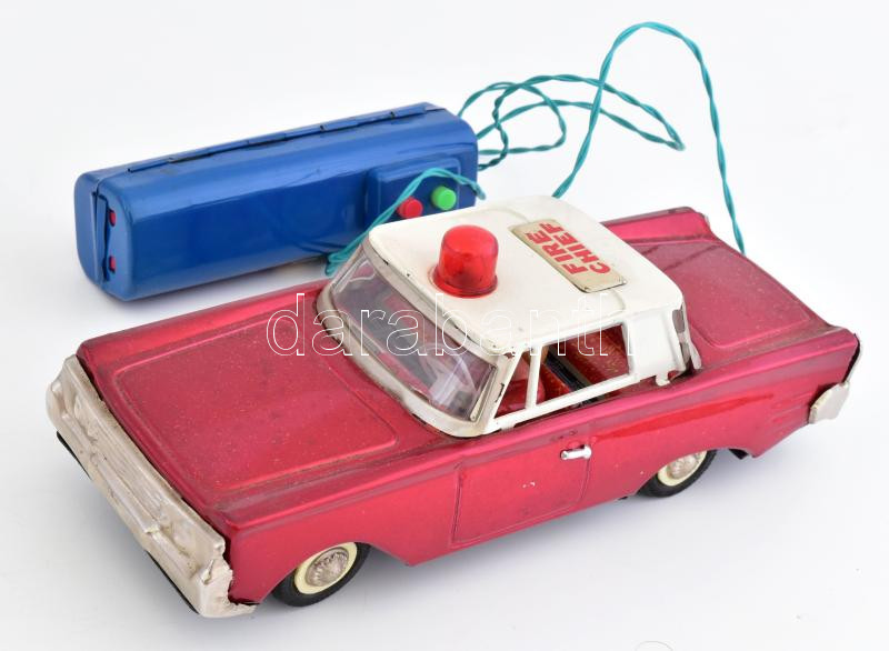 Fire Chief retró kínai játék tűzoltóparancsnoki autó, vezetékes távirányítóval. Elem nélkül, nincs kipróbálva. Eredeti dobozában (doboz sérült), korának megfelelő állapotban.
