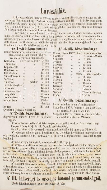 Leírás: 1857 Buda, III. hadseregi és országos katonai parancsnokságtól kiadott hirdetmény lóvásárlással kapcsolatban
