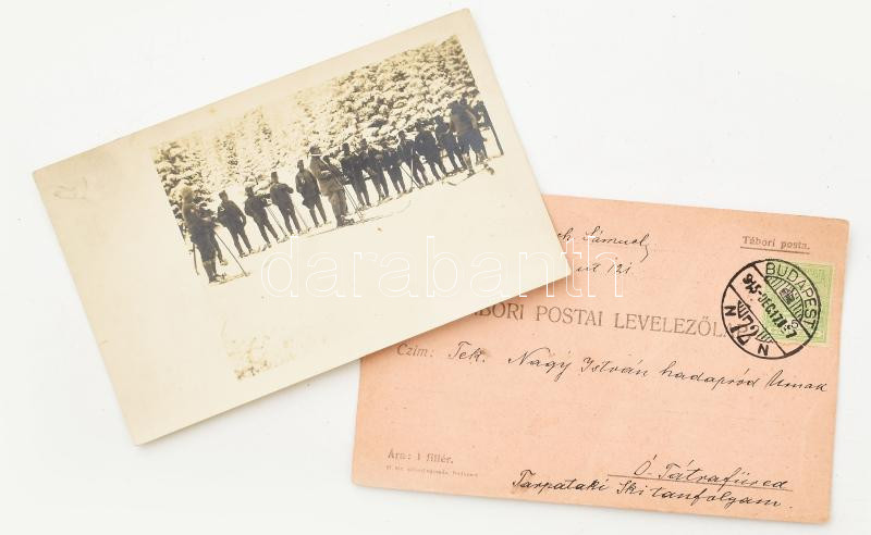 1915 Haitsch Sámuel, később az elektromos művek ügyvédjének tábori levelezőlapja Ó-Tátrafüredről, a tarpataki sítanfolyamról Nagy István hadapródnak, mellette a sítanfolyam tagjairól készült fotólappal, 8x13 cm