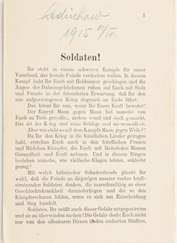 Leírás: 1915 I. vh. röpcédula, osztrák-magyar, német nyelven, nemi betegségekkel kapcsolatban, 4 oldal, első oldalon korabeli ceruzás felirattal