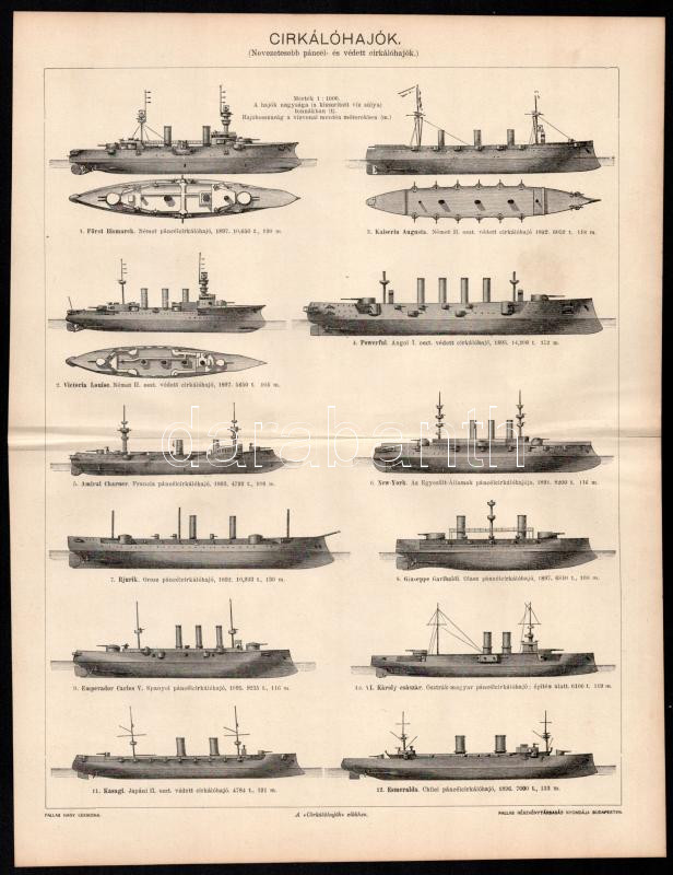Leírás: cca 1900 Cirkálóhajók (Nevezetesebb páncél- és védett cirkálóhajók), nyomat, Pallas Nagy Lexikona, Bp., Posner-ny., 30x24 cm