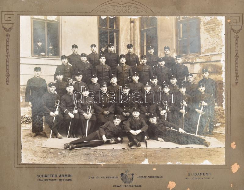 Leírás: cca 1910-15 Magyar katonák csoportképe egy beazonosítandó laktanya udvarában, keményhátú fotó Schäffer Ármin felvétele, apró kopásokkal, 22x28 cm
