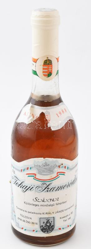 Tokaji Szomorodni, 1988, Tolcsva, Király János bortermelő, 0,5l, fehér... https://www.darabanth.com/hu/456-Gyorsarveres/456.0/Mutargy-papirregiseg-egyeb/Muzealis-borok-italok~500017/Tokaji-Szomorodni-1988-Tolcsva-Kiraly-Janos-bortermelo-0-5l-feherbor-bontatlan-kisse-serult~II3041277