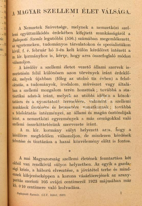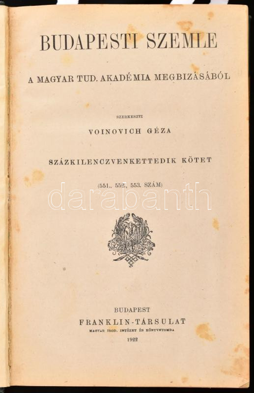 1922-1923 Budapesti Szemle 192., 193., és 194. kötete. Szerk.: Voinovich Géza. Bp., 1922-1923, Franklin, 240+240+240 p. Átkötött félvászon-kötésben, a 2. rész címlapját és tartalomjegyzékét annak a végére kötötték be, a 3. rész címlapja hiányzik, néhány aláhúzással, a gerincen kis sérüléssel.