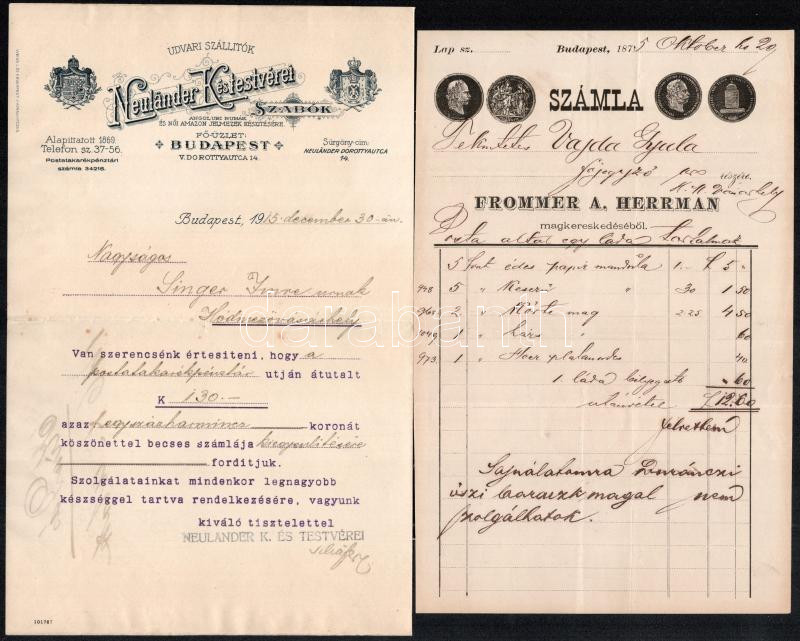 Leírás: cca 1870 2 budapesti számla: Frommer Hermann magkereskedő, Neulander ruha