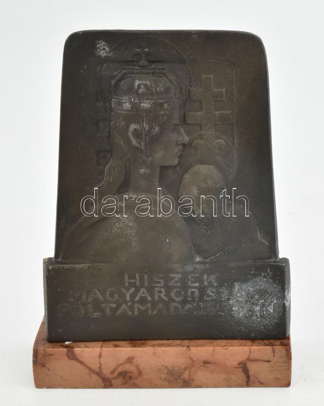 cca 1925 Lukácsy Lajos (1876-1927): "Hiszek Magyarország föltámadásában" irredenta fém kisplasztika, márvány alapon, alsó rögzítő része eltört, 15x12 cm