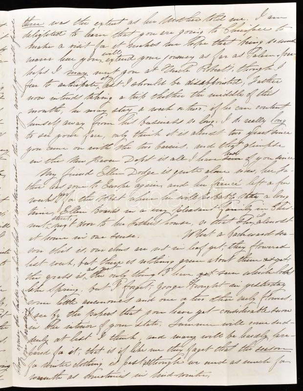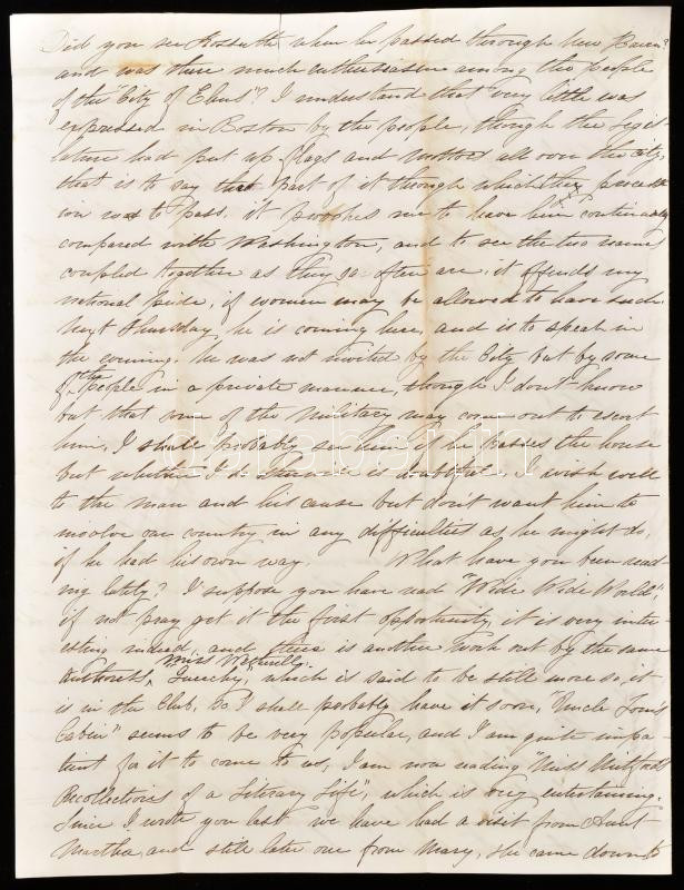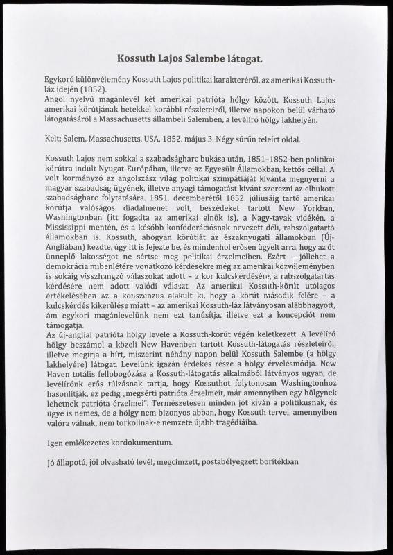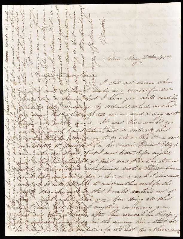 1852 Egykorú különvélemény Kossuth Lajos politikai karakteréről, az amerikai Kossuth-láz idején. Angol nyelvű magánlevél két amerikai patrióta hölgy között, Kossuth Lajos amerikai körútjának hetekkel korábbi részleteiről, illetve napokon belül várható látogatásáról a Massachusetts állambeli Salemben, a levélíró hölgy lakhelyén. Kelt: Salem, Massachusetts, USA, 1852. május 3. Négy sűrűn teleírt oldal. Jó állapotú, olvasható levél, eredeti, megcímezett és bélyegzett borítékkal. Érdekes kordokumentum. / 1852 English language letter about Lajos Kossuth Hungarian politician and statesman, between two patriotic American ladies, regarding Kossuth's tour of the United States and his upcoming visit to Salem, Massachusetts. Four pages in total, in good condition, with original envelope.