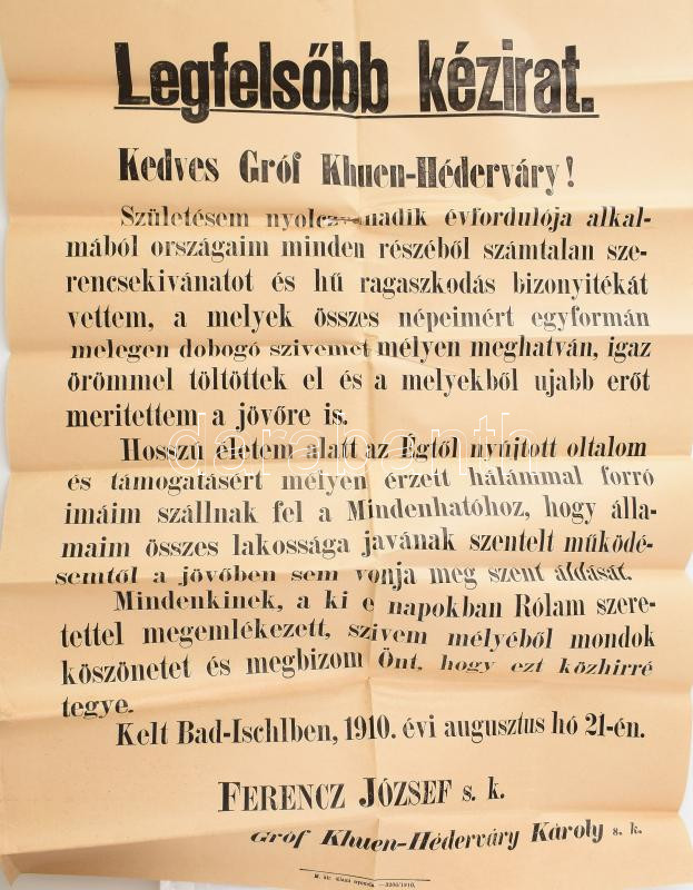 1910 Ferenc József császár 80. születésnapja alkalmából kifejezett köszönete Khuen-Héderváry miniszterelnöknek címezve, Falragasz formájában kinyomtatva. Hajtásnyommal, kis szakadásokkal 50x70 cm