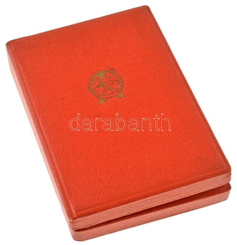 Leírás: 1957. "Szocialista Munkáért Érdemérem" zománcozott fém kitüntetés mellszalagon, szalagsávval, Rákosi-címeres tokban T:AU patina NMK 604.