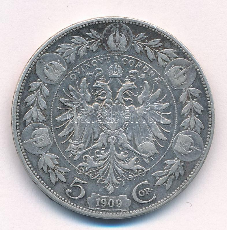 Austria 1909. ... https://www.darabanth.com/hu/456-Gyorsarveres/456.0/Numizmatika/Kulfoldi-fem-es-ezustpenzek~2000016/Ausztria-1909-5K-Ag-Ferenc-Jozsef-T-VF-F-patina-phAustria-1909-5-Corona-Ag-Franz-Joseph~II3043465