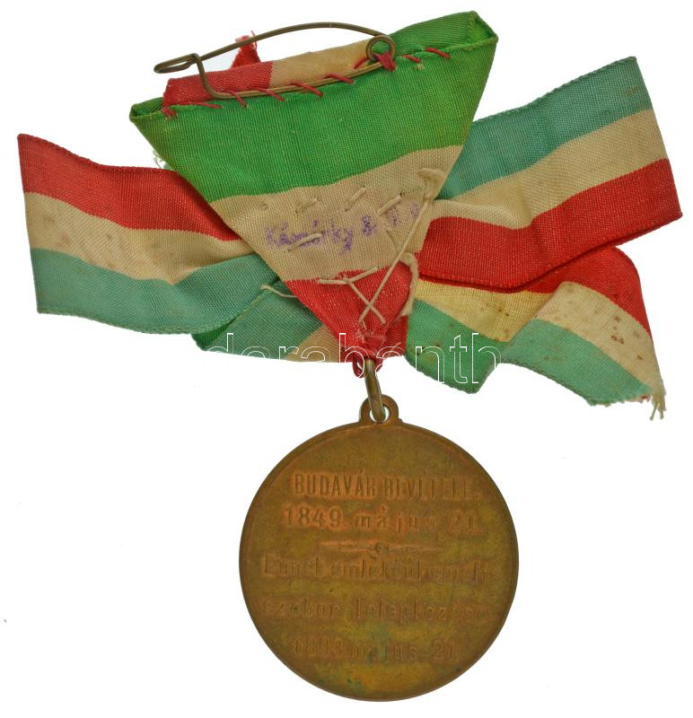 1893. "1849/49-iki HONVÉD / BUDAVÁR BEVÉTELE 1849. május 21. - Ennek emlékéül emelt szobor leleplezése 1893. május 21." bronz emlékérem mellszalagon (34mm) T:AU,XF patina