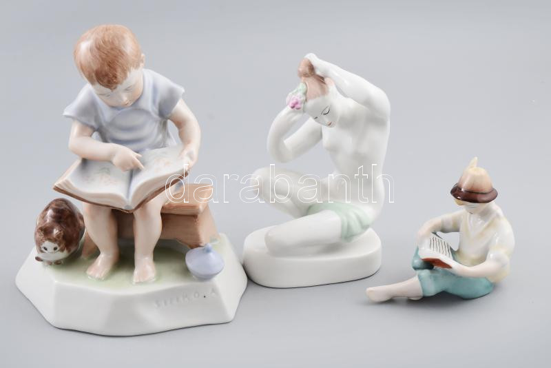 Leírás: Zsolnay olvasó fiú (könyöke ragasztott) + Aquincum női akt + Hollóházi olvasó fiú, jelzett