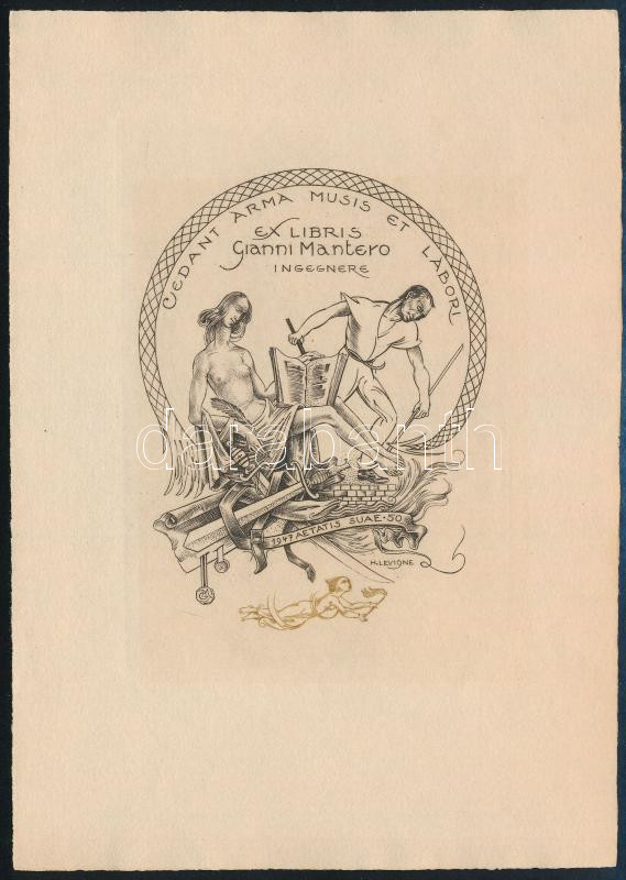 Leírás: 1947 H. Levigne: Ex libris Gianni Mantero, rézkarc, papír, jelzett, 15×10,5 cm