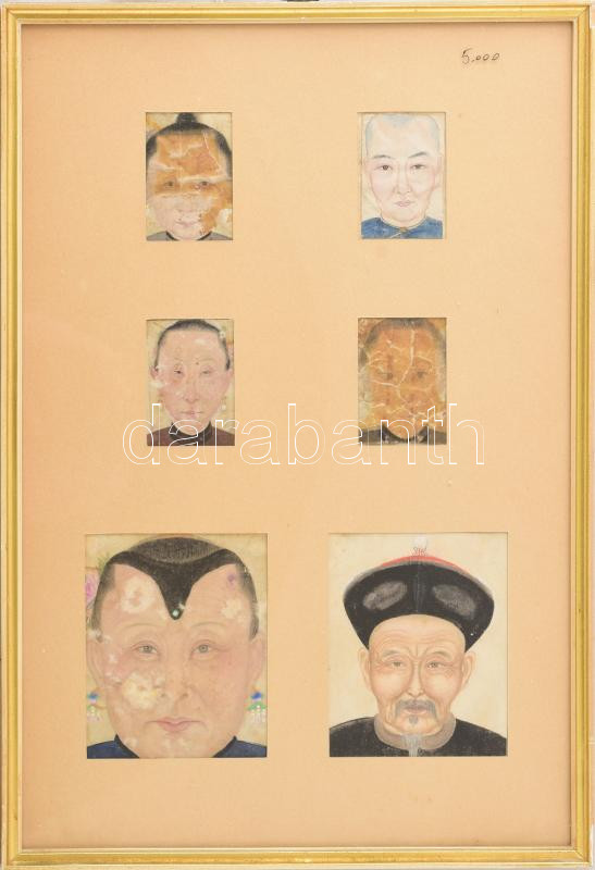Jelzés nélkül: Ázsiai arcképek, össz. 6 db egy keretben. Vegyes technika, papír, foltos, részben sérült. Üvegezett, kissé sérült fakeretben, 6x4 (x4) és 10,5x8 (x2) cm