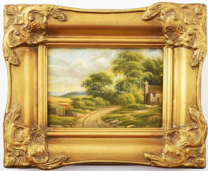 Leírás: Jelzés nélkül: Táj. Olaj, fatábla. Dekoratív fakeretben. 13x18 cm