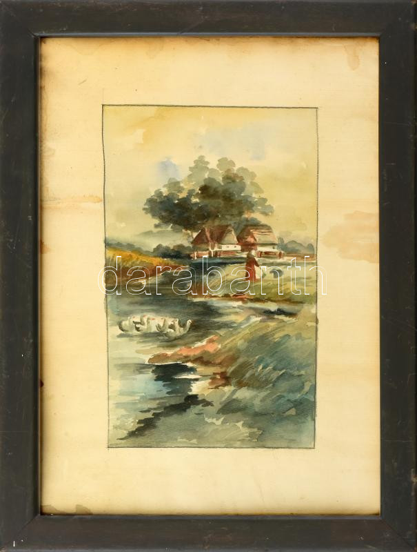 Leírás: Jelzés nélkül, XX. sz. első fele: Tanya. Akvarell, papír. Foltos. Dekoratív, üvegezett, kissé sérült fakeretben, 30x18 cm.