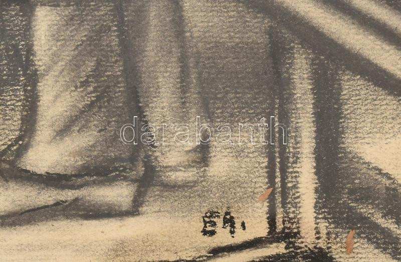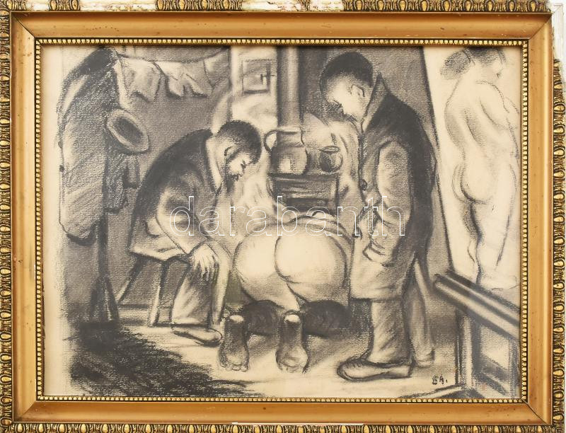 Leírás: Olvashatatlan jelzéssel (EA?): Műterem akttal. Szén, papír. 28x37 cm. Üvegezett fakeretben.