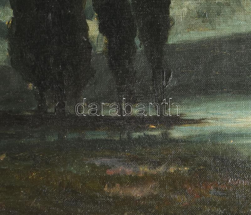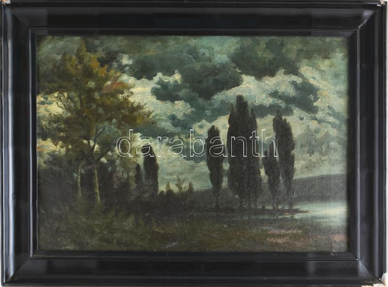 Leírás: Olvashatatlan jelzéssel: Felhők az erdő felett. Olaj, vászon, jelzett, sérült keretben 34x50 cm