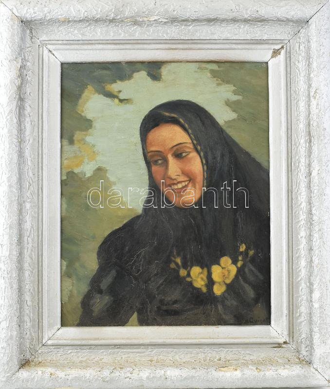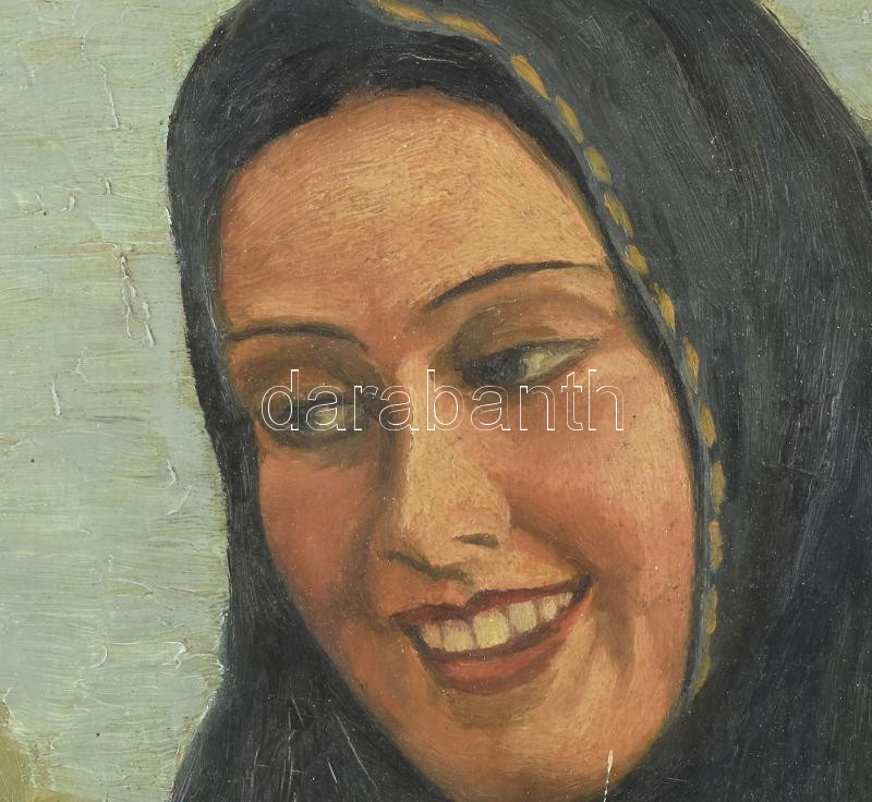 Leírás: Olvashatatlan jelzéssel (Qu...): Mosolygó hölgy portréja. Olaj, falemez, keretben. 50x40 cm