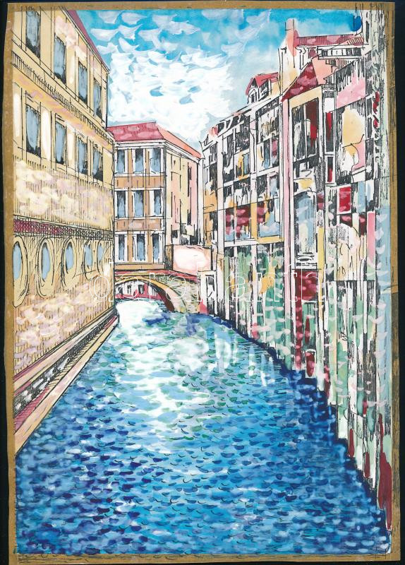 Leírás: B. Hajdú László (1926-1998): Velencei részlet. Akvarell, tus, papír, jelzés nélkül. Lap szélén paszpartuzás nyomaival, 29,5×21 cm