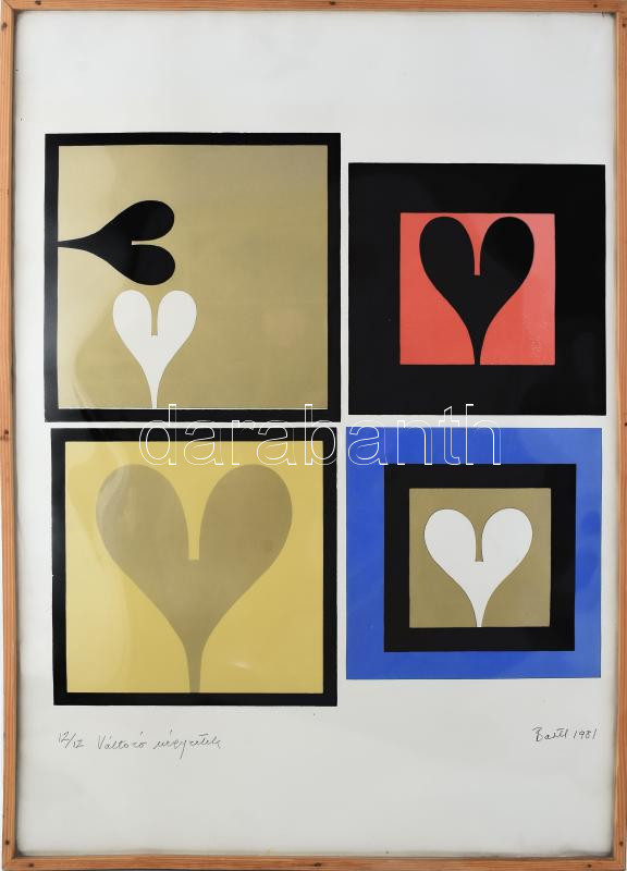 Bartl József (1932-2013): Változó négyzetek, 1981. Szitanyomat, papír, jelzett, számozott: 12/12. Lap alsó szélén egészen apró sérüléssel. Plexiüvegezett, sérült fakeretben. 54x51,5 cm. Mindössze 12 példányban készült, gyűjtői darab!