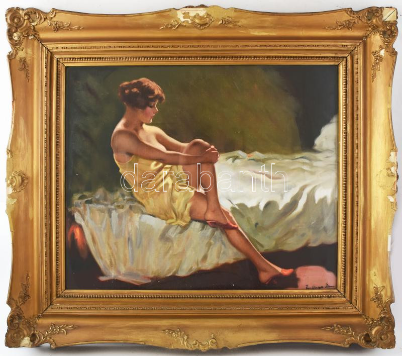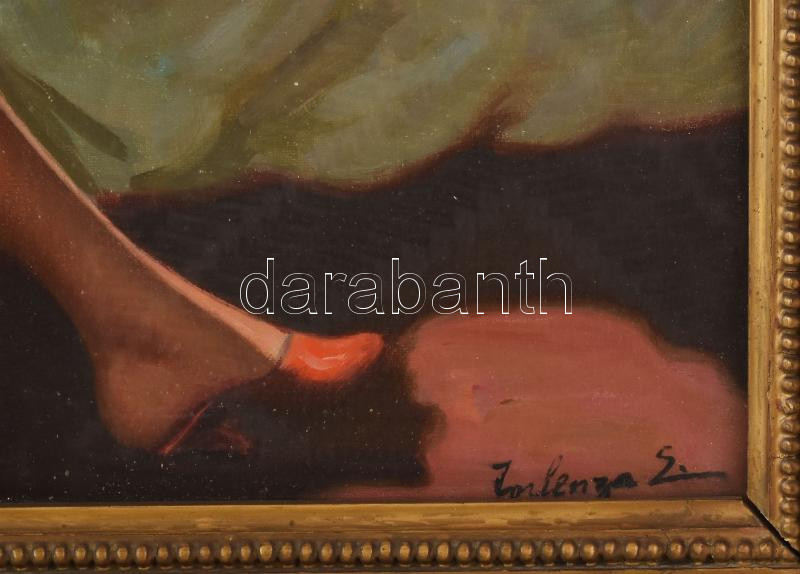 Leírás: Eduardo Forlenza (1861-1934): Csábító hölgy. Olaj, vászon, jelezve jobbra lent. 50x60 cm. Dekoratív, üvegezett, sérült fakeretben.