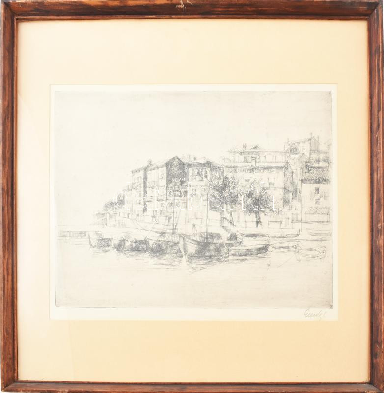 Leírás: Élesdy István (1912-1987): Kikötő. Rézkarc, papír, jelzett, üvegezett fakeretben, 29,5x39,5 cm