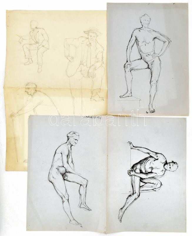Leírás: F. Rados Márta (1931-2021): Tanulmányrajzok össz. 3 db lapon. Ceruza, tus, papír, kettő jelzett. 1 lap hajtásnyommal. 50x38 és 35x25 cm