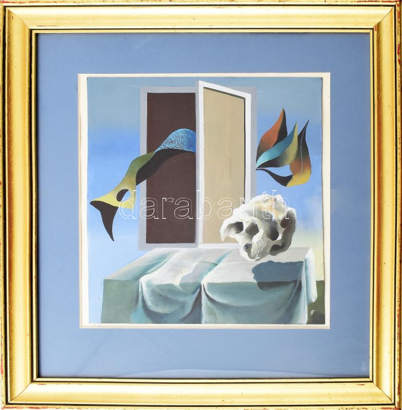 Leírás: Farkas József (?-): Szürrealista kép. Tempera, karton. Jelezve jobbra lent. Üvegezett fakeretben. 28x26 cm