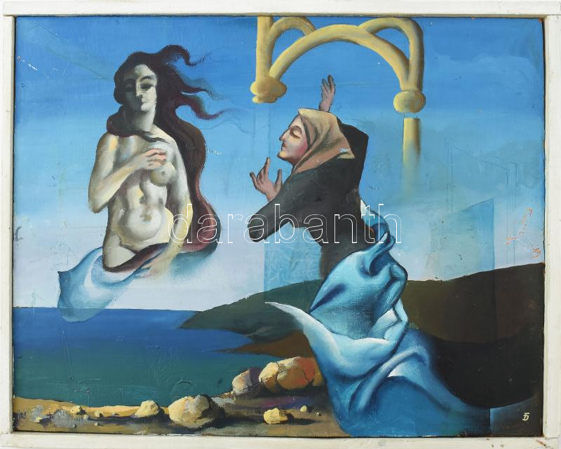 Farkas József (?-): Szürrealista vénusz. Olaj, falemez. Jelezve jobbra lent. Hátoldalán autográf felirattal. Apró felületi sérülésekkel. Fakeretben. 29,5x37 cm