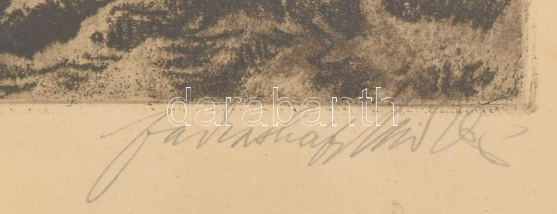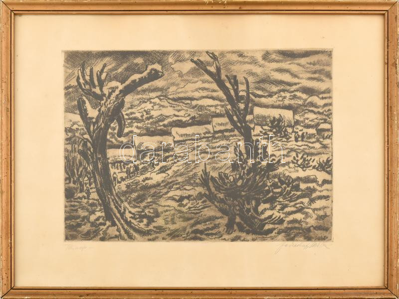 Leírás: Farkasházy Miklós (1895-1964): Téli nap. Hidegtű, papír, jelzett, üvegezett fakeretben, 22,5×29,5 cm