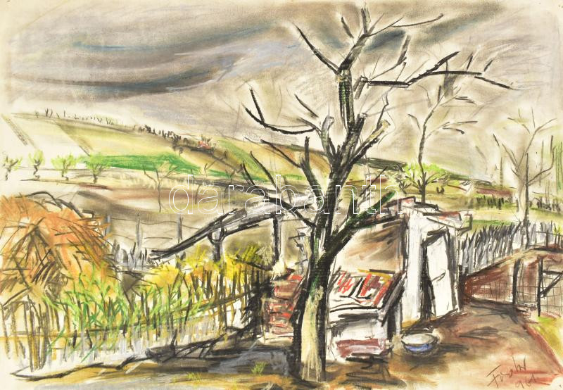Leírás: Fodor József (1935-2007): Kert (Hódmezővásárhely?), 1961. Pasztell, papír, jelzett, 43x61 cm
