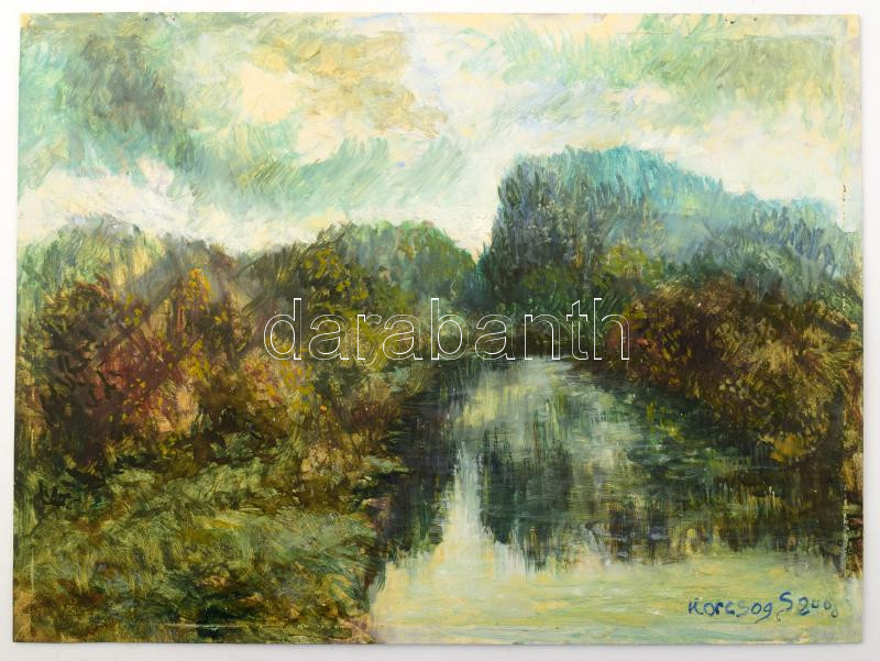 Leírás: Korcsog Sándor: Vízparti táj, olaj, karton. Jelezve jobbra lent: Korcsog S 200(?). 24x32 cm