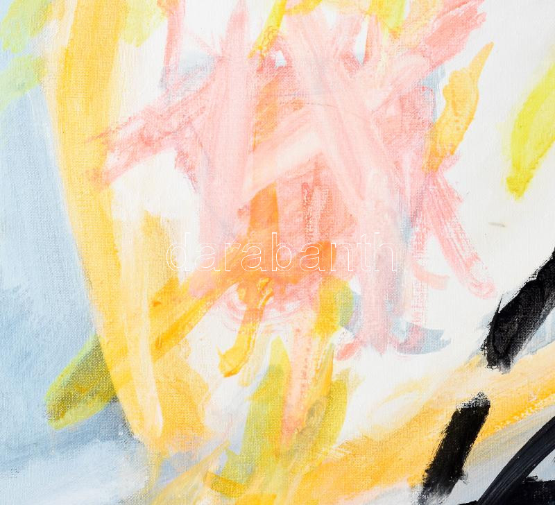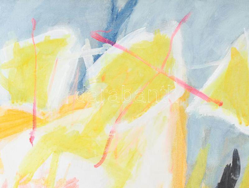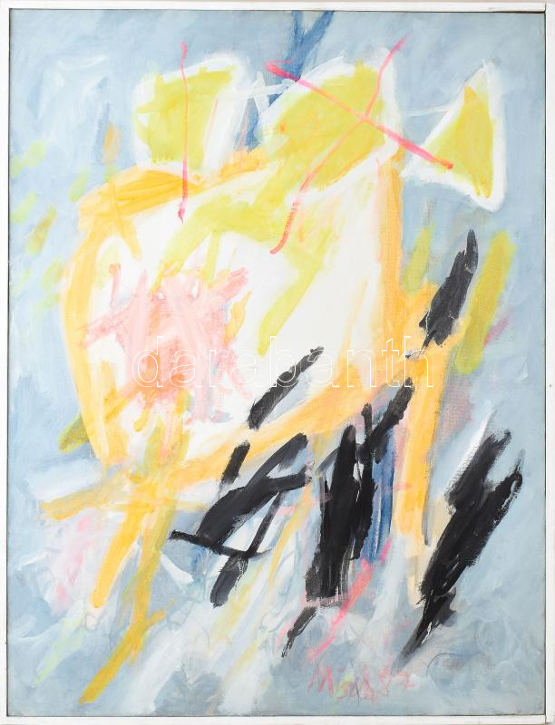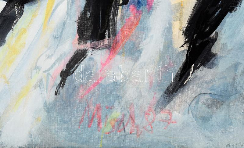 Misch Ádám (1935-1995): Már megint, 1987. Akril, vászon, jelezve középen lent, hátoldalán Misch Ádám autográf feliratával és névjegyével, fakeretben, 80x60 cm. / Adam Misch (1935-1995): Again, 1987. Acrylic on canvas, signed, with autograph description by Adam Misch and his business card on the reverse, framed, 80x60 cm