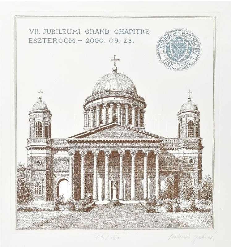 Leírás: Molnár Gabriella (1940-): Bazilika, Esztergom. Rézkarc, papír, jelzett, számozott (76/120), apró törésnyomokkal, 25×22 cm