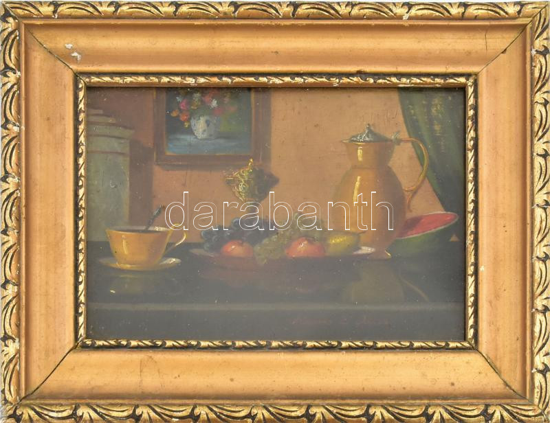 Leírás: Molnár Z. János (1880-1960): Csendélet. Olaj, fa, jelezve jobbra középen lent. Dekoratív, üvegezett, kissé kopott fakeretben, 14x19 cm