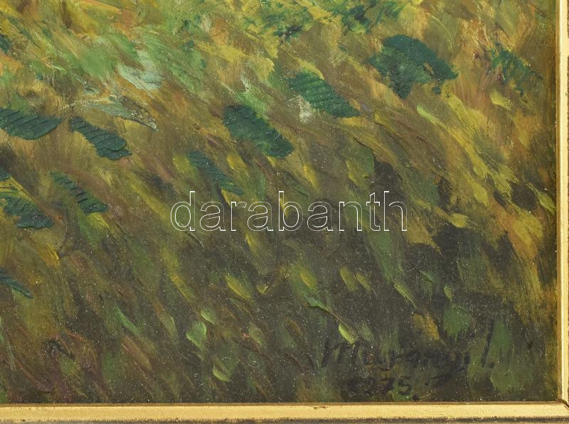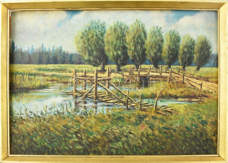 Leírás: Murányi Imre (-): Lébényi táj. Olaj, farost. Jelzett. Hátoldalán autográf felirattal. XIX. sz. Dekoratív fakeretben, 36×50 cm