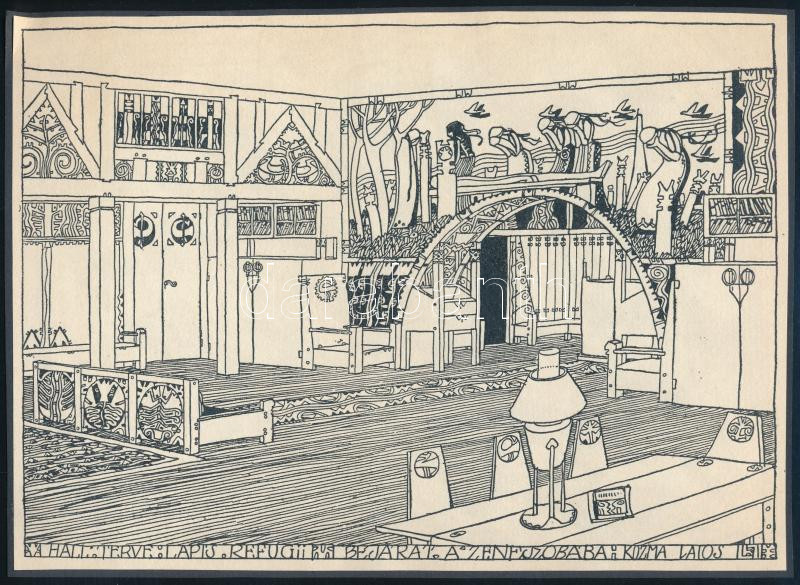 Leírás: cca 1908 Kozma Lajos (1884-1948): "A hall terve, Lapis Refugii, Bejárat a zeneszobába", fametszet, papír kartonra kasírozva, jelzett a dúcon, 16x22 cm