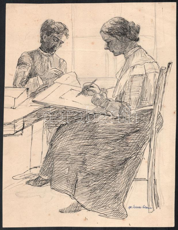Leírás: gróf Nemes Polixéna (-): Hölgyek az asztalnál. Tus, papír, jelzett. 26x20 cm