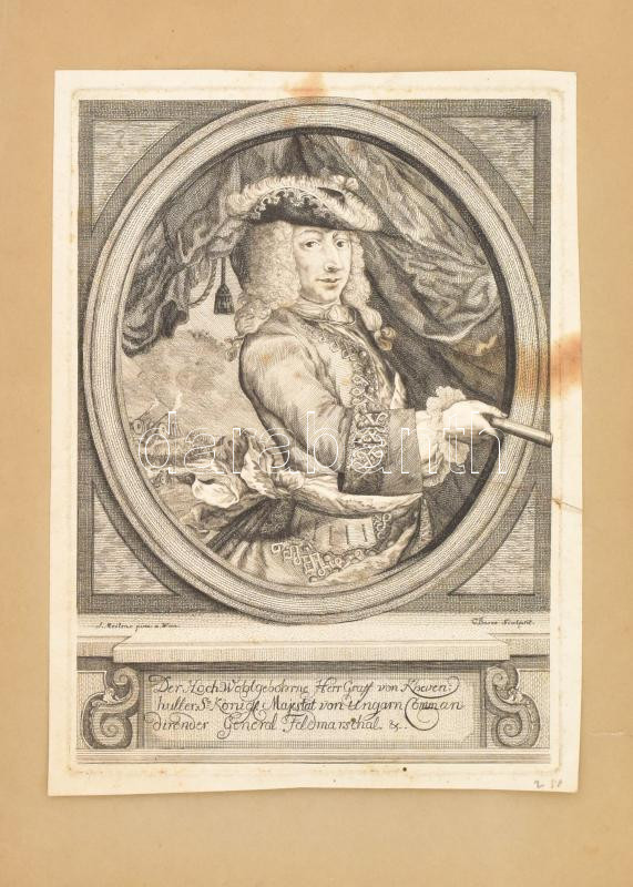 Ludwig Andreas von Khevenhüller, Graf von Aichelberg-Frankenburg (1683-1744), a magyar király tárbornagya, rézmetszet, papír, jelzett a metszeten, foltos, szakadással, körbevágva, 24x17 cm