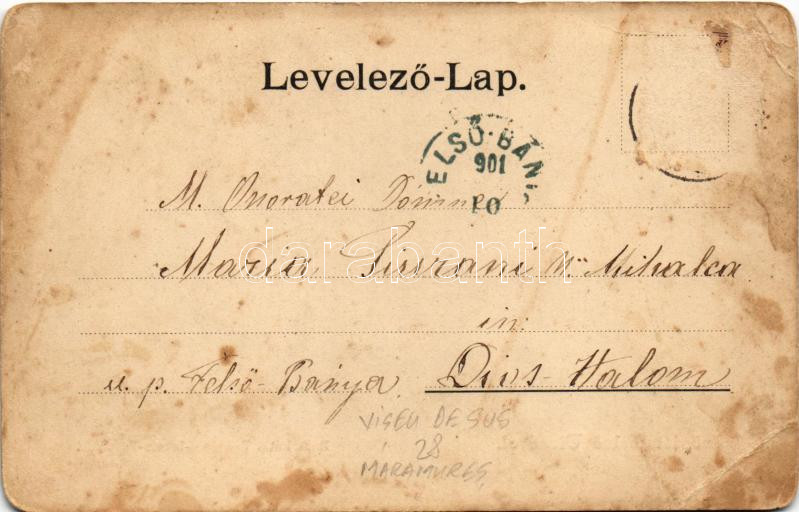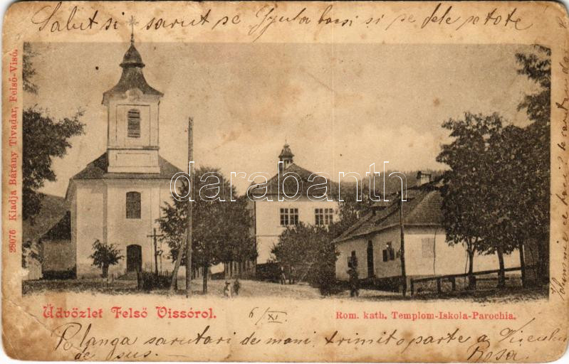 1901 Felsővisó, Felső-Visó, Viseu de Sus; Római katolikus templom, iskola és parókia. Bárány Tivadar kiadása / Catholic church, school and parish (kopott sarkak / worn corners)
