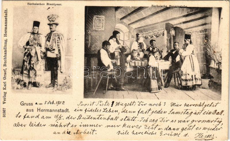 1902 Nagyszeben, Hermannstadt, Sibiu; Sächsisches Brautpaar und Bauernstube / Erdélyi szász házaspár és vendéglő. Karl Graef / Transylvanian Saxon restaurant and married couple, folklore (EK)