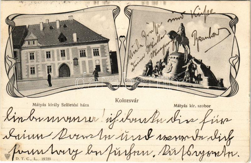 Leírás: 1903 Kolozsvár, Cluj; Mátyás király szobor és születési háza / statue and birthplace of Matthias Corvinus. Art Nouveau (EK)