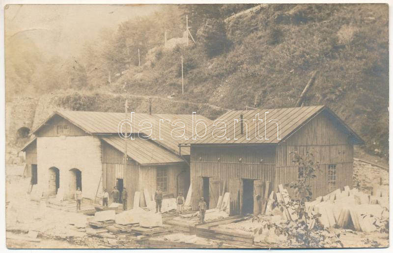 Leírás: 1922 Ruszkabánya, Rusca Montana; Bibel-féle márványtelep, gyár munkásokkal / marble works factory. photo (r)