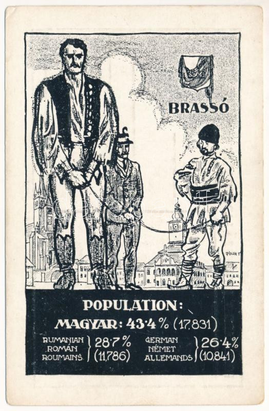 Brassó, Kronstadt, Brasov; Magyar, német és román (oláh) nemzetiségek népesség aránya. Címer, Pátria rt. kiadása / Percentage of Hungarian, German and Romanian population. Irredenta art postcad with coat of arms s: Pólya Tibor (EK)