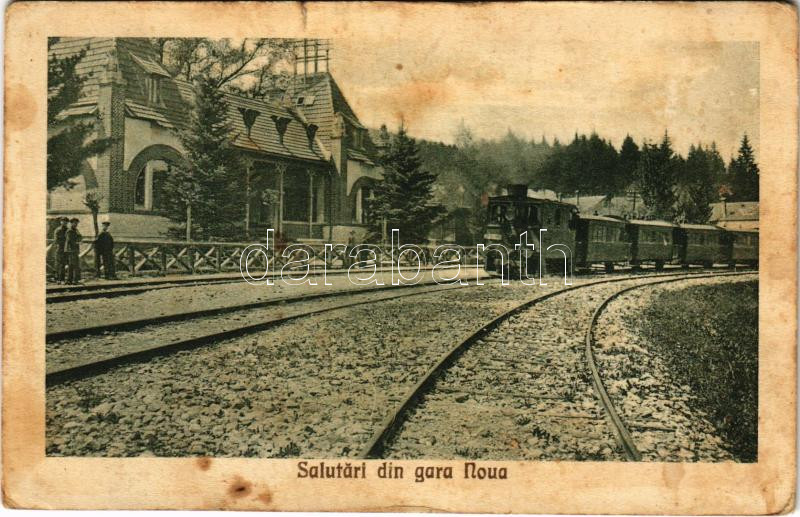 Brassó, Kronstadt, Brasov; Noa nyaraló városi-elővárosi vasútállomás gőzmozdonnyal / Gara din Noua / Bahnhof / railway station with locomotive, train (szakadás / tear)