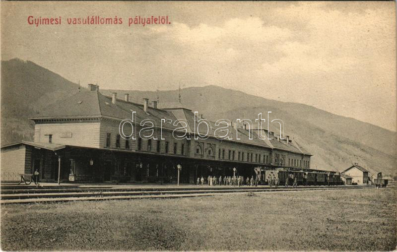 Leírás: Gyimes, Ghimes; vasútállomás pálya felől, vonat / railway station, train (EK)