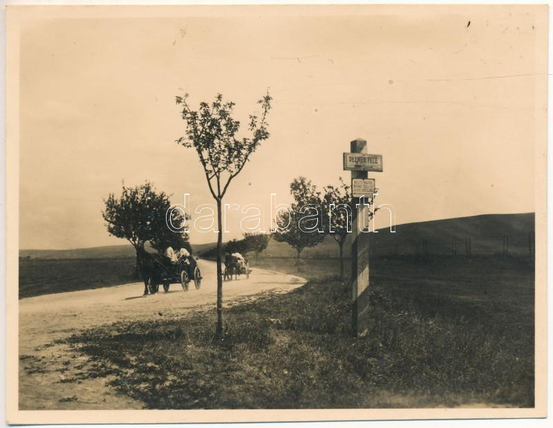 Leírás: Kolozsvár, Cluj; Dezmér felé vezető út a város határában, lovaskocsik / road toward Dezmir, horse carts. photo (11,6 x 8,9 cm)